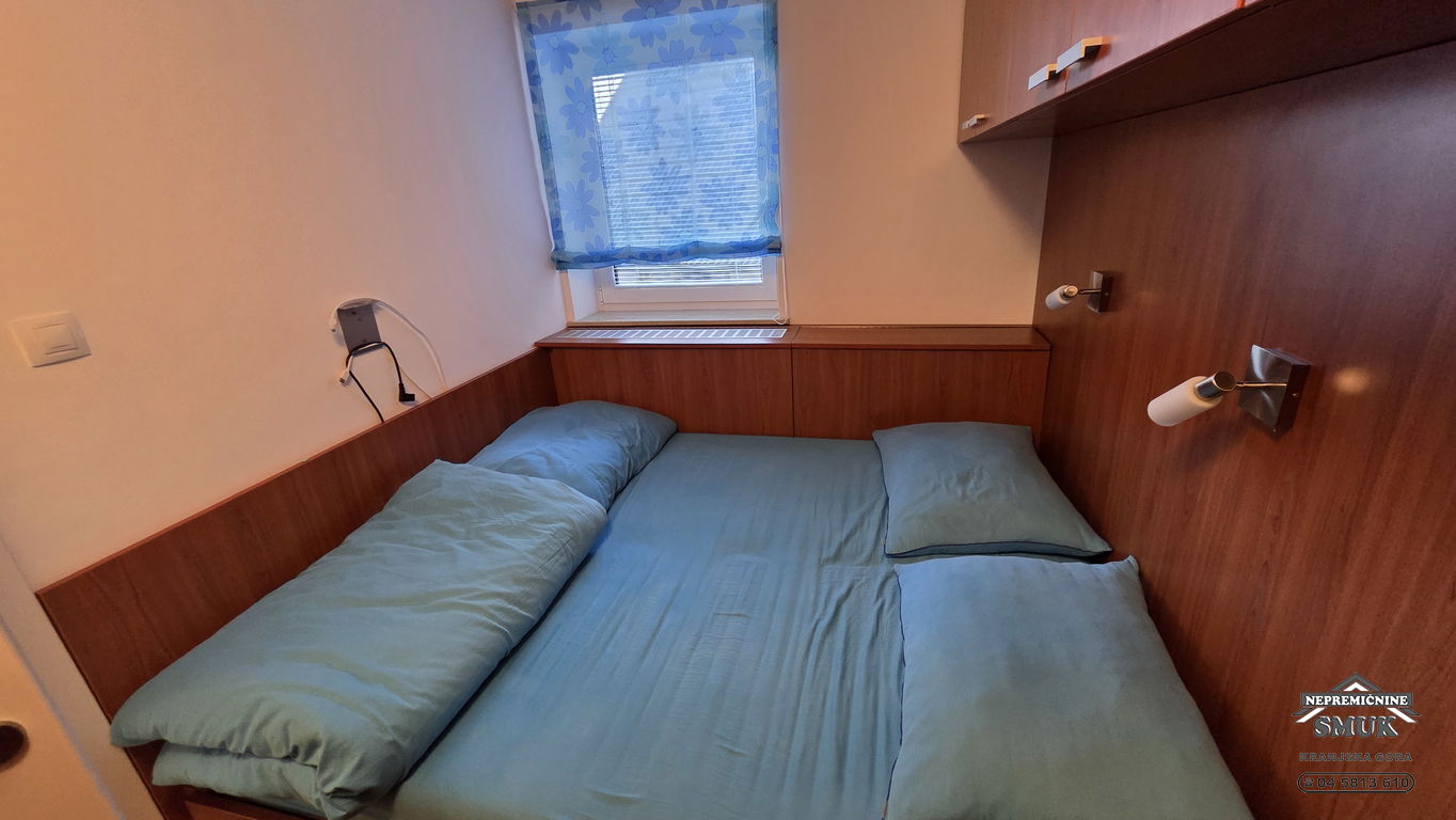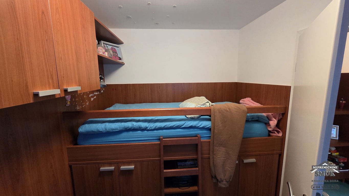 V spalnici je postavljena vgrajena zakonska postelja s samostojno nekoliko dvignjeno otroško posteljo. Celotno pohištvo je ročno izdelano iz lesa češnje.