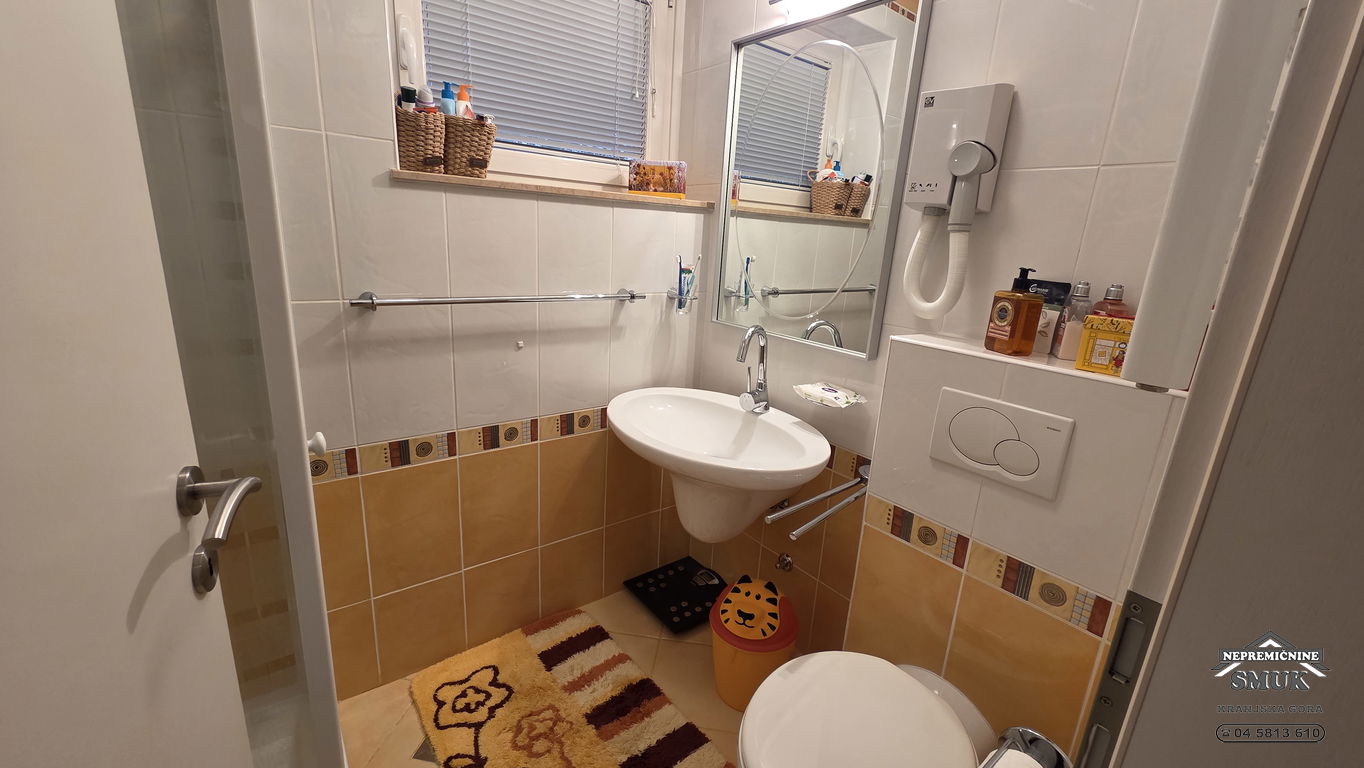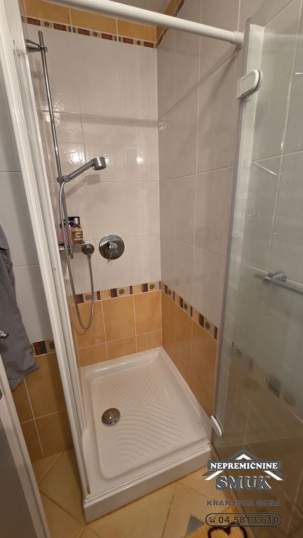 Vgrajena je tuš kabina s steklenim vrtanim krilom.