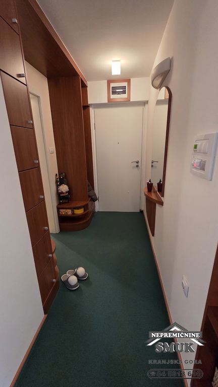 V predprostoru je vgrajena omara za oblačila z ogledalom in več predali za shranjevanje oblačil.