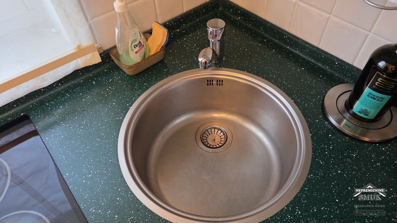 V pult je v kotu vgrajeno Inox pomivalno korito proizvajalca Blanco z armaturo.