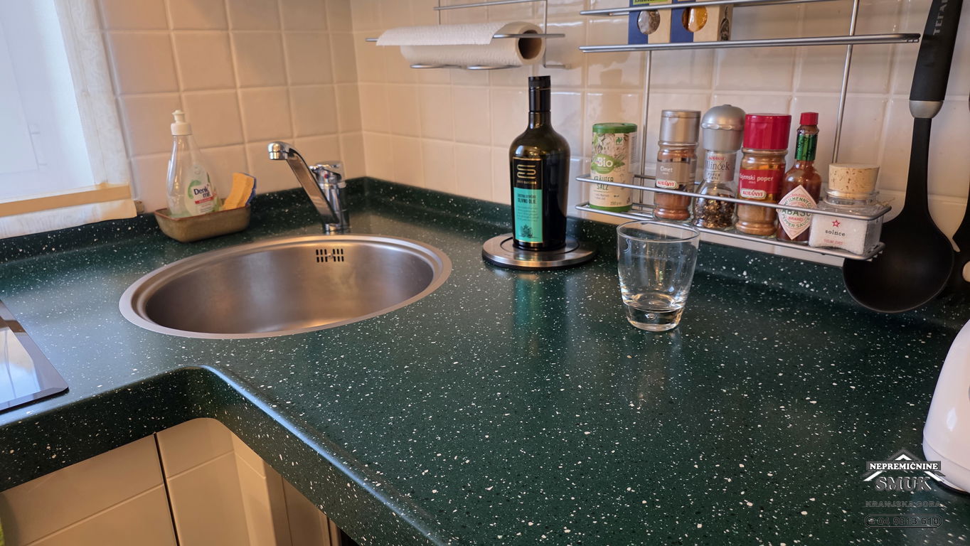 Celotna kuhinjska oprema je izdelana po naročilu. Vgrajen je kerok delovni pult.