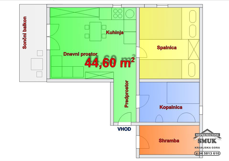 Stanovanje se nahaja v večstanovanjskem objektu. Stanovanje po podatkih GURS-a obsega 44,60 m2 neto tlorisne površine.